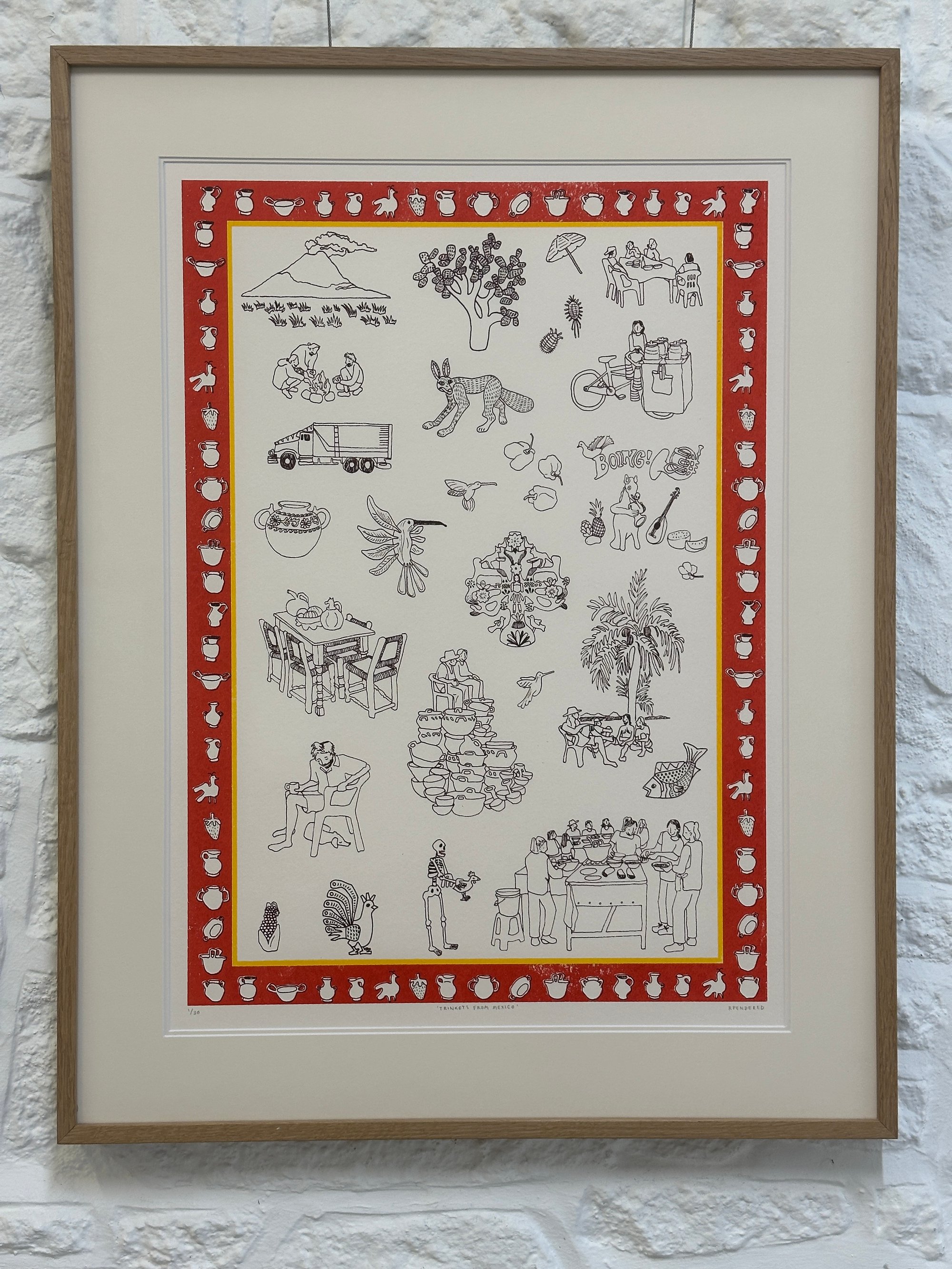 This print contains a collection of memories and motifs from Mexico, inspired by tapestries at the folklore museum in Mexico city. Coyotes in the volcanoes, muy picante peppers, quesadilas, alarm clock birds, Falafel our favourite beach dog, cochineal insects that make red dye, Frida's kitchen table, and our staple mango boing.
